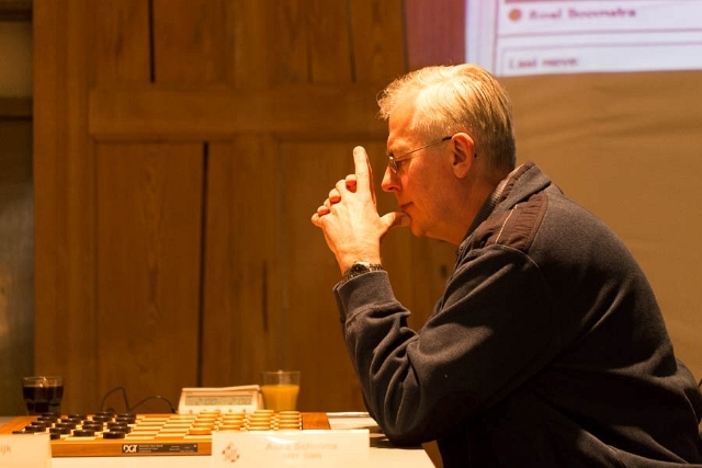 De partij die als eerste uit was, was die tussen Roel Boomstra en Auke Scholma. Op de 27e zet overzag Scholma een forcing die schijfwinst voor Boomstra opleverde. Toen deze de juiste zetten afleverde, liet de nestor onder de deelnemers zich de rest niet meer bewijzen. De winstgang was weliswaar enigszins verborgen, maar voor een speler van het kaliber Scholma was de miszet toch wel een blundertje te noemen. Een eerste aanwijzing dat ouderen wellicht in het nadeel zijn. Boomstra hoorden we niet klagen, want hij gaat nog steeds zonder puntverlies aan kop.