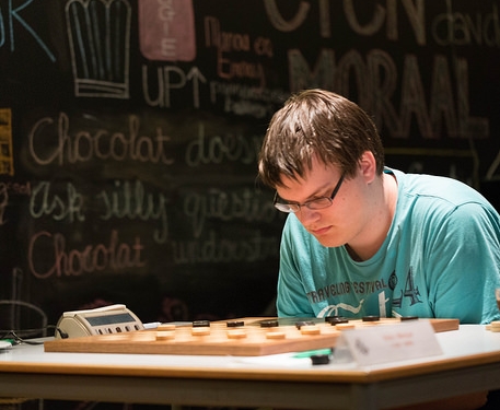 Jan ziet er uit als een jonge liberaal met bijbehorende forse lichaamsbouw. Denk aan Hans van Baalen. Maar gelukkig zit hij nu niet op het pluche in het Europees Parlement, maar in Huissen in een meubelzaak achter een dambord. Toen hij zich in het kwalificatietoernooi na zeven punten uit vier partijen dreigde te plaatsen, overwoog ik een fanclub op te richten. Wouter Sipma dreigde mijn feestje echter te verstoren, maar in de benodigde barrage eigende Jan uit Oerterp zich zijn verdiende NK-ticket toe.